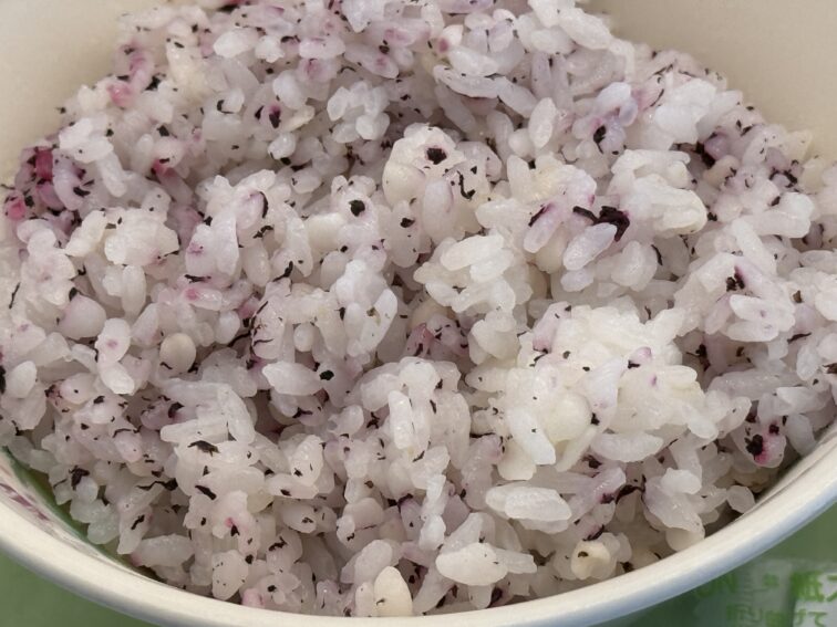 ハトムギ入りしそごはんには、小矢部産のハトムギが入っています。小矢部を中心とした地域はハトムギの生産量日本一です。しそのさわやかな香りときれいな色で、さっぱりと食べやすいですね。