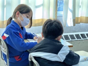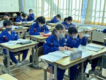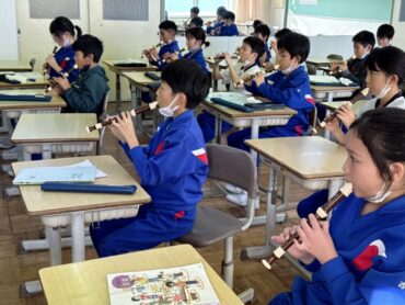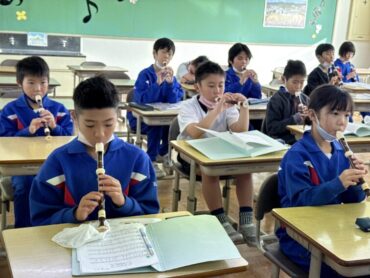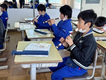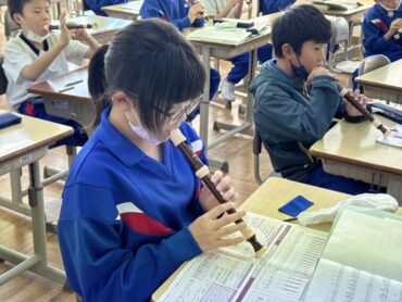 音楽の授業。リコーダーで「オーラ リー」を練習しました。2部のパートに分かれての演奏です。二つのパートのリズムと音色が重なり合うととても美しい曲になりました。