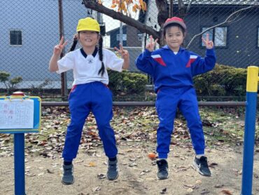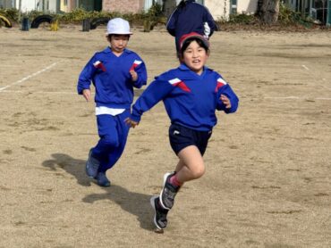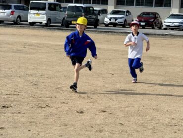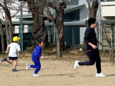 グラウンドで鬼ごっこ。鬼に追いつかれないように、一生懸命に走って逃げています。足の速い先生も一緒に鬼ごっこに参加していました。1年生は一生懸命に追いかけていました。
