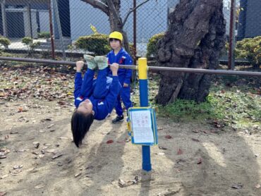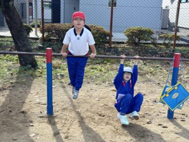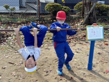 体育では鉄棒をしていました。いろいろな技に挑戦して、先生から鉄棒カードにスタンプを押してもらいました。