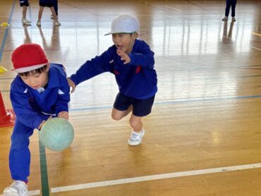 体育「ドリブルインベーダーゲーム」です。ドリブルが上手になってきました。守る方は、相手チームを前に進めさせないように、左右に手を広げて動き、ブロックしました。