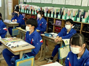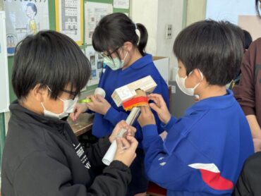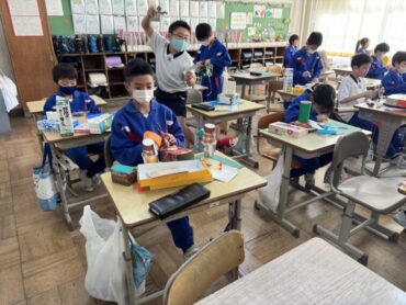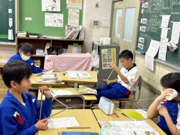 6限の理科では音の伝わり方の勉強をしていました。トライアングルと紙コップを糸でつないで、糸の震えと音の伝わり方の実験をしたようです。もう少し早くいけば実験の様子がもっと見られたのに……残念!