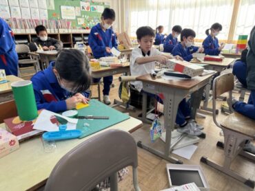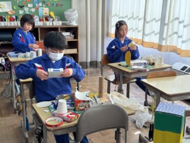 学校へぱんぱんの袋を持ってくる子が何人もいるなと思っていたら、4年生の図工の「紙のはこ 大へんしん!!」の材料だったということが分かりました。いろいろな形や大きさの箱や筒、紙コップ等を切ったり張ったりして組み合わせています。大変身の結果、どのようなものに生まれ変わるでしょうか?