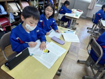 国語は「みきのたからもの」の勉強でした。ワークシートに登場人物についてまとめていました。