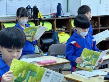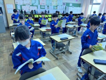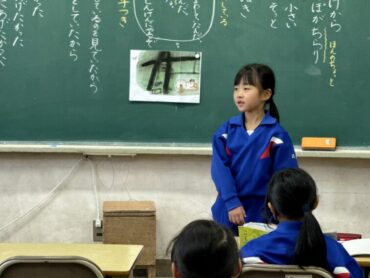 国語「たぬきの糸車」を全員で音読しているところです。その後、進んで手を挙げた1年生が、一人は音読し、もう一人はその場面のたぬきの様子を演じました。