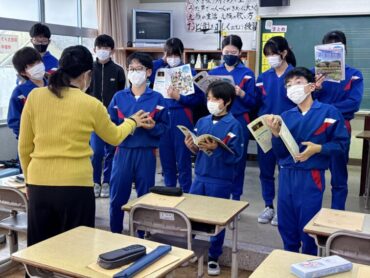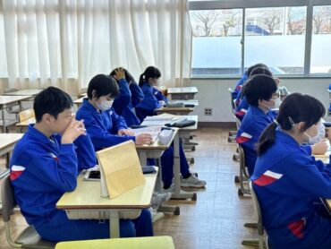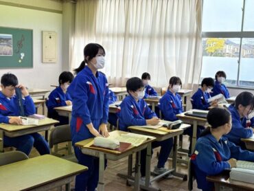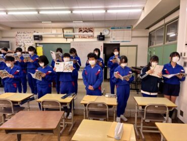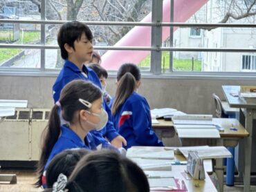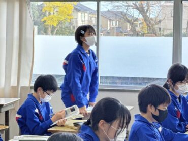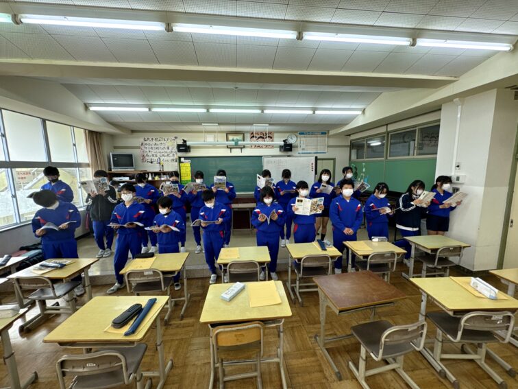 音楽の授業です。1組と同じように「ふるさと」を歌う声が聞こえてきていましたが、音楽室に行くと音楽の先生から「箱根八里」の説明を聞いているところでした。その後CDで男性4部合唱の歌を聴いて、感じたことや気付いたことを発表しました。力強い歌声や、歯切れのよいリズム等を感じ取っていました。