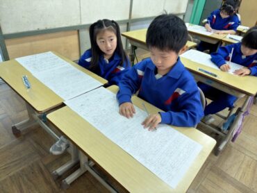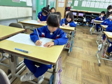 書き方で「お手紙」をお手本を見ながら丁寧に書いていました。「あー疲れたー」という様子の2年生もいましたが、「あーよく頑張ったー!」という気持ちもあるでしょう。濃く、丁寧な文字で、行や文字を抜かすことなく仕上げるのはとても大変だったことでしょう。本当によく頑張りました。
