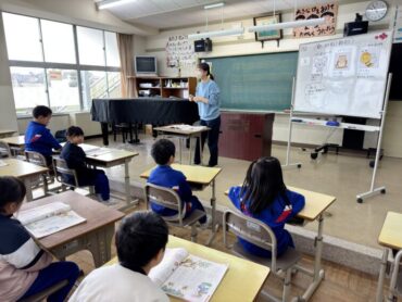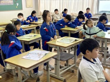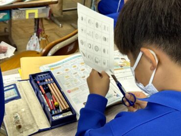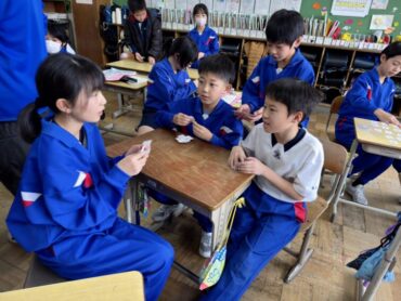 盛り上がっているので見に行くと、外国語活動の時間でした。アルファベットの勉強をしていて、かるたをしていました。白熱した勝負でした。