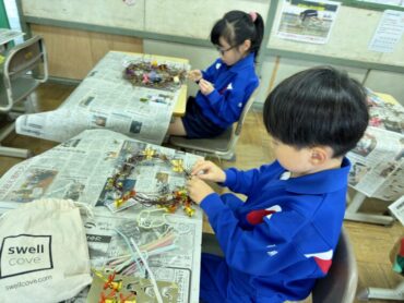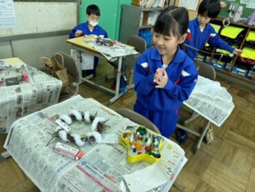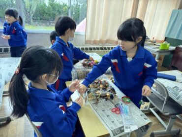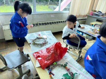 あさがおのつるを使って、クリスマスリース作りをしました。イメージ通りにできたのかな?とても嬉しそうです。きれいなリボンやキラキラ光る飾りをたくさん付けて、リース作りに夢中になっていました。