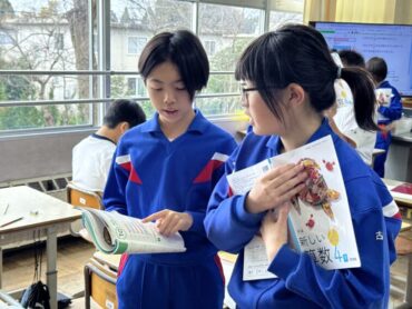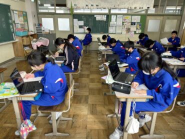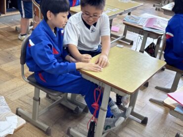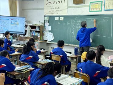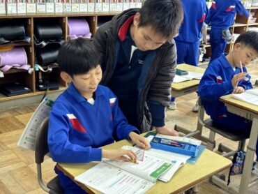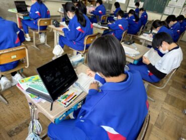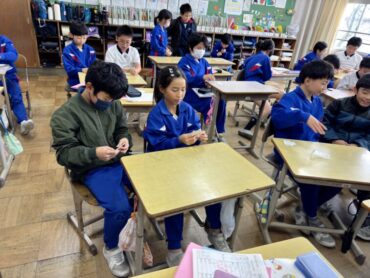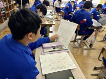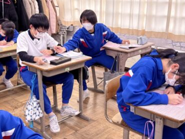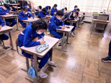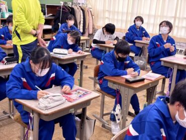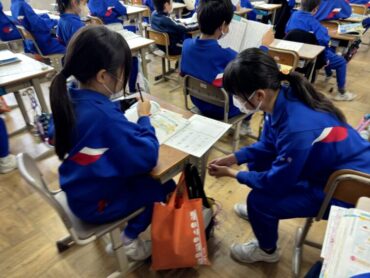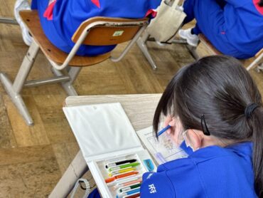 英語の授業でみんな黙々と”My best memory is ~”のワークシートを書いていました。最低3文以上書いて、覚えて、イラストを描き加えました。運動会等の行事や立山登山等の活動が特に思い出に残っているようです。