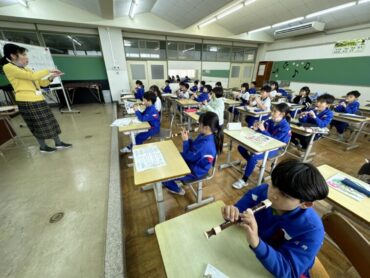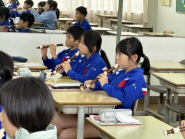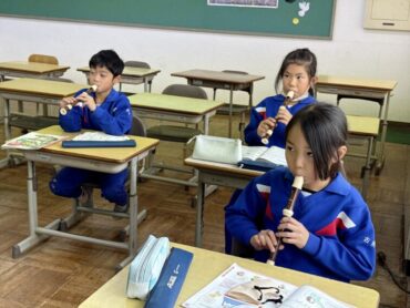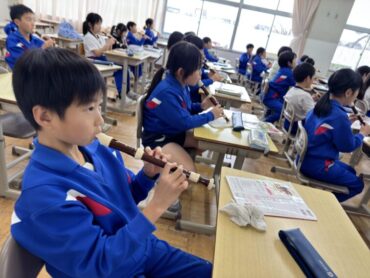 3年生の音楽はリコーダー練習です。曲の終わりが全員そろうように、先生の手の動きを見て息を止める練習をしました。集中して先生を見ていて、ピタッと音が止まると、きれいに終わった感じがしてよかったです。