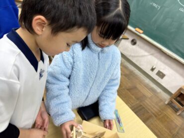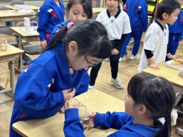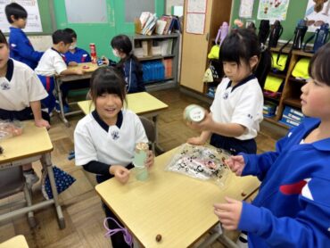 生活科「あきのあそびランド パート2をしよう」でした。順番に回って、友達が作ったどんぐり等を利用したマラカス等の楽器やけん玉、やじろべえ等のおもちゃを楽しみました。