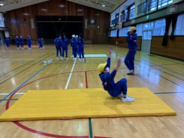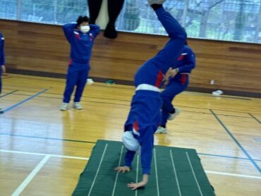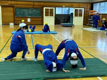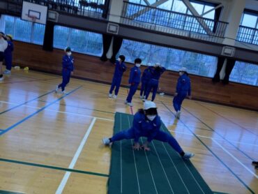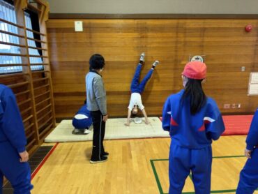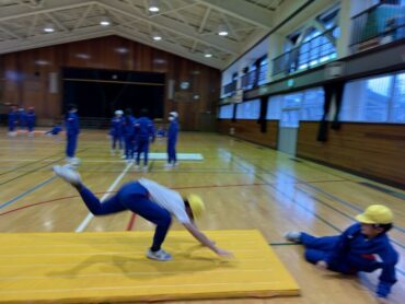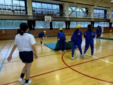 体育の授業でマット運動が始まりました。跳び前転、開脚前転、側転、壁倒立、ブリッジ等、練習の場所に分かれて技に挑戦しました。片付けも力を合わせて、てきぱきと進めていました。