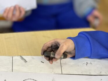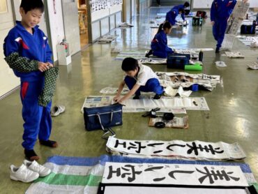 教室前広場で書初練習です。もう書き終わってできた作品を眺めている児童や提出に来ている児童も見られました。一方でじっくりと集中して、筆を動かしている児童もいました。保護者会のときに掲示してあるのでご覧ください。