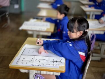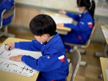 書初練習をしているところでした。ゆっくりと力を入れて書いています。力の入り過ぎでしょうか、手が真っ黒になっている1年生もいました。服は汚れなかったかな?