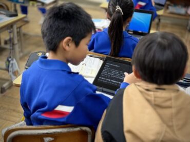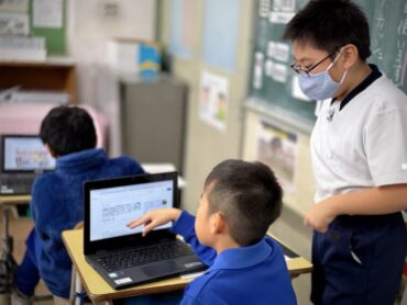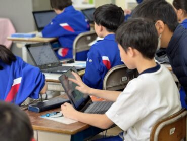 国語科の授業です。学習専用端末を使って、「自然・災害」について調べていました。調べたことを青い付箋に書いて、ノートにたくさん貼ってありました。