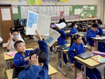 算数の授業で、「重さ」についての教科書の問題に取り組んでいるところでした。授業がよく分かったのでしょうか、たくさん手が挙がり進んで発表しました。もちろんバッチリ正解です!