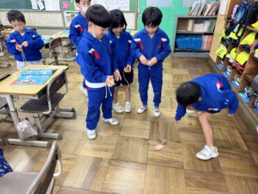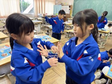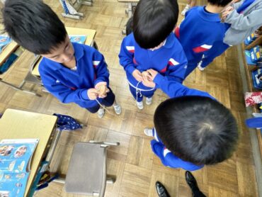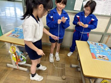 生活科の授業で、「ふゆのあそび」をしました。こまやめんこ、あやとり、けん玉等の遊びです。こまは上手に回せた1年生もいましたが、やったことのない子も多くいて、何度も挑戦していました。いろいろな遊びを体験してみましょう。