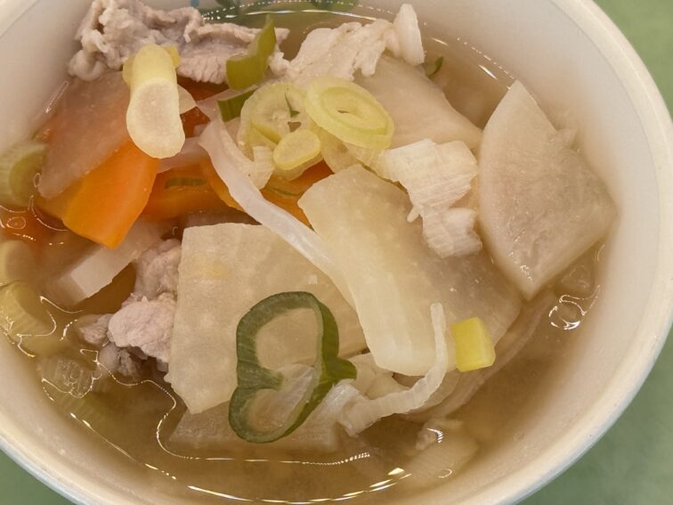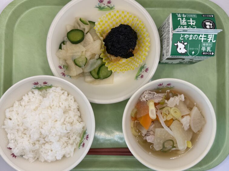 2025.12.18 NEW 全校生 12/18(木)の給食 12/18(木)の給食です。郷土食献立です。 ごはん 牛乳 揚げ出し豆腐のごまだれ 豚汁 色とり 今日は、郷土食献立の日です。富山県の郷土料理の一つに「色とり」という料理があります。富山県では「かぶらごき」という名でも親しまれています。色とりは、かぶとかぶの葉をさっと茹で、塩としょうゆで味付けした料理です。色とりは作りたてがおいしいので、新鮮な葉が付いたかぶを見かけたらぜひ家庭でも作ってみてください。