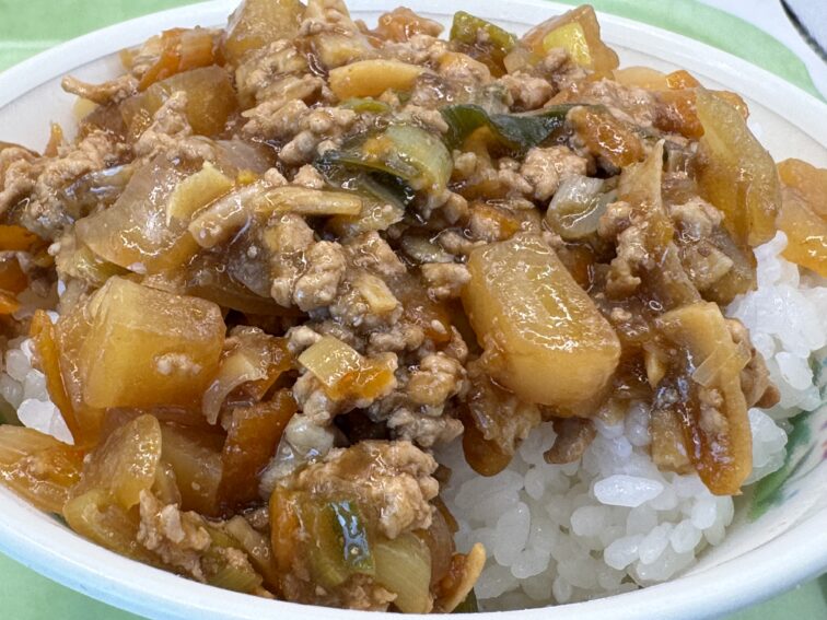 今月のたかおか食19丼は、高岡で取れた野菜がたくさん入った「高岡野菜の肉みそ丼」です。今日の食19丼に入っている高岡産の野菜は、大根と生椎茸です。