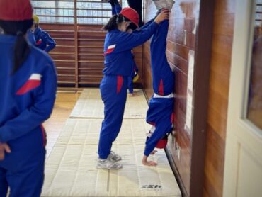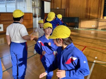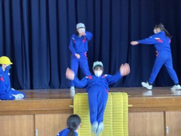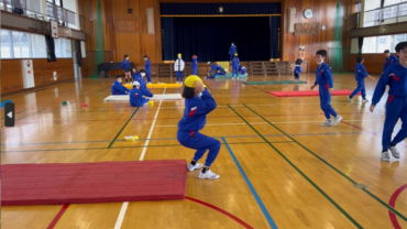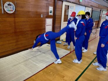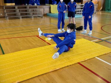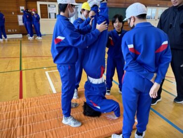 体育のマット運動。力を合わせて、技の練習に励んでいます。失敗しても何度も繰り返しているところがいいですね。きっとできるようになることでしょう。自分の技を増やしましょう。