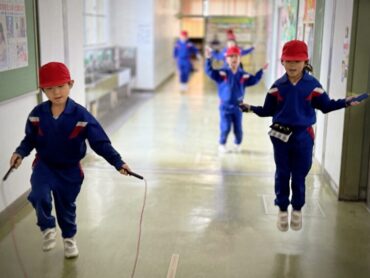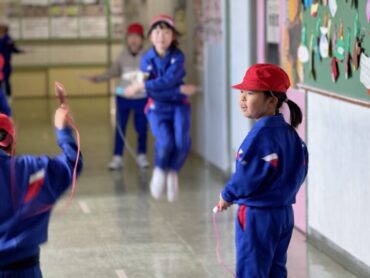 廊下で短なわとびをする2年生