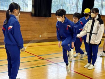 体育で短縄跳びをしていました。自分が挑戦したい技の跳んだ回数を友達にカウントしてもらっています。二重跳び、交差跳び、失敗しても何度でも繰り返し頑張っていました。