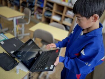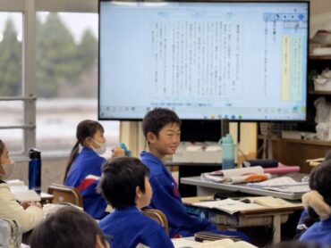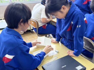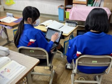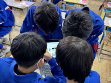 国語「おすすめのパンフレットを作ろう」で、学習専用端末を中心にして、友達と頭を突き合わせてパンフレットづくりに取り組んでいます。みんな端末を上手に使いこなしているので、素敵なデザインのパンフレットが完成することでしょう。