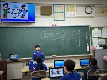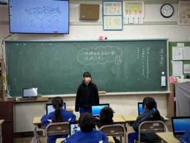 学習専用端末をみんな開いています。「ふゆ休みのおもい出はっぴょうかい」です。端末で描いた絵を映しながら、すごろくをしたことや雪だるまを作ったこと等を紹介しました。楽しい冬休みの様子が伝わってきました。