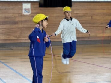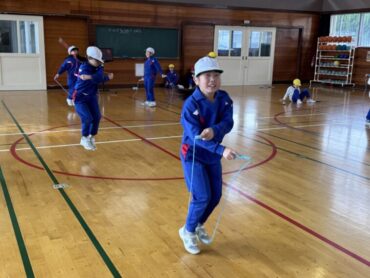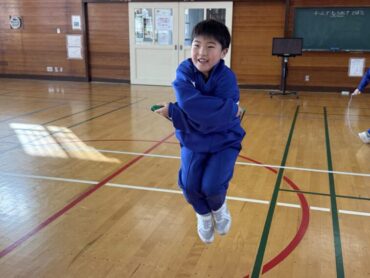 体育の授業で、縄跳びをしていました。前跳び、後ろ跳び、かけ足跳び、交差跳び、いろいろな跳び方に挑戦しています。なかなかできなくても、何度でもチャレンジしてみているのがいいですね。きっとできるようになりますよ。
