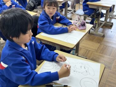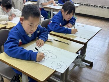 「大きいかるたを作ろう!」で画用紙で大きな取り札を作っていました。小さな札を参考にしながら、画用紙いっぱいに上手に絵を描きました。この後、色も塗るようです。みんなでジャンボかるたをすると楽しいですね。