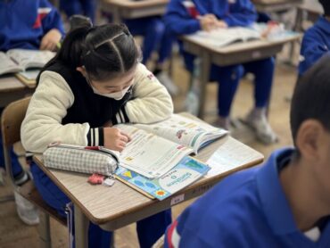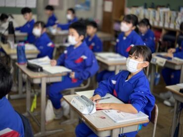 英語の授業でリスニングをしているところでした。「町のすてきなところ」を紹介する英文を聞きながら、話しているところを教科書を指でなぞりました。音と文字がちゃんと合っている5年生が多かったです。