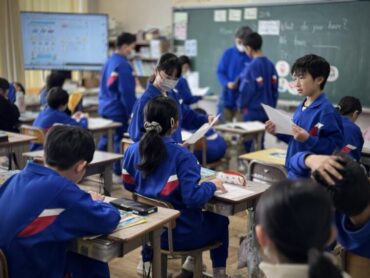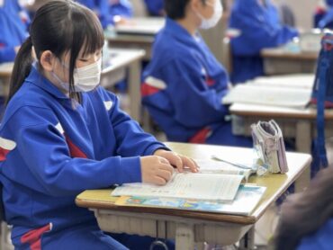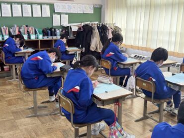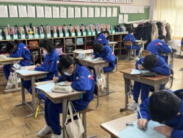 静かに、算数のチャレンジテスト中。そっと覗いて教室を出ました。全員合格を祈っています!結果はいかに?