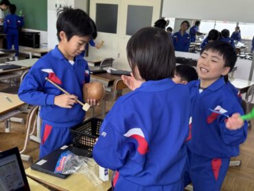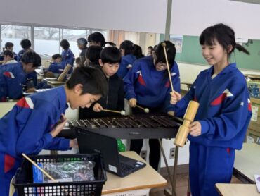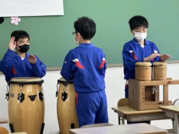 音楽の授業では打楽器だけを使ったリズム譜を考えて、演奏練習をしていました。体を使って、ノリノリ!の4年生もいました。