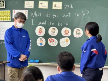 英語の授業で”What do you want to be?” “I want to be a ~”の会話を先生とデモンストレーションをしていました。話したり、相手の反応にリアクションを返したりするなど、とても上手にできていました。その後、他の児童も教室を回りながら、尋ねたり、答えたりする会話を体験しました。