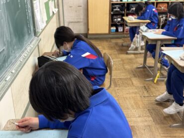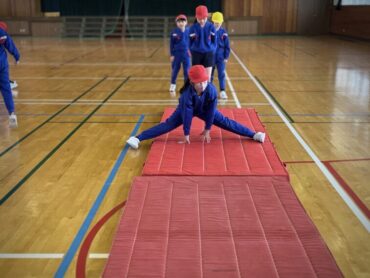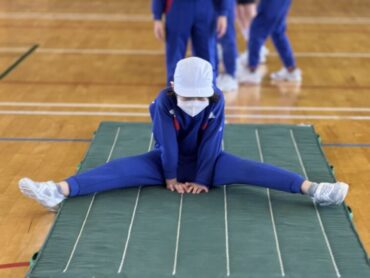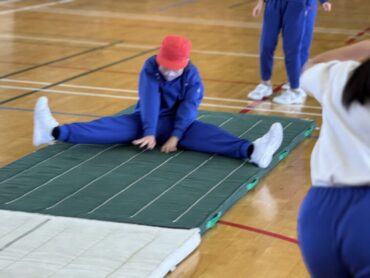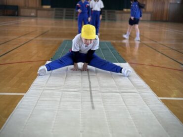 体育のマット運動で開脚前転の練習に取り組んでいました。脚がきれいに伸びてとても上手にできている3年生が何人もいました。前転のスピードが足りなかったり、両手のつき方が弱かったりして惜しい児童もみられました。あと少しです。きっとできますよ!頑張りましょう。