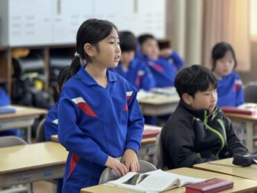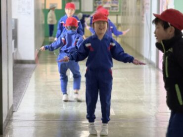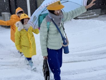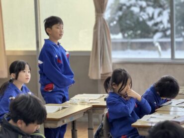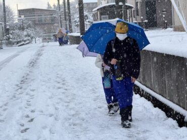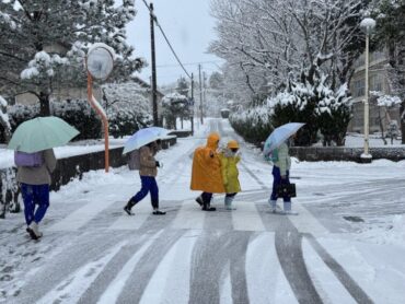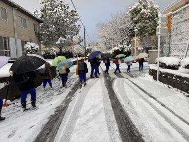 うっすらと雪の積もった道を整然と登校してきました。登校班長が時々後ろを振り返りながら、下級生を見守ってくれています。雪の日が続きそうです。交通安全に気を付けて登校しましょう。