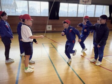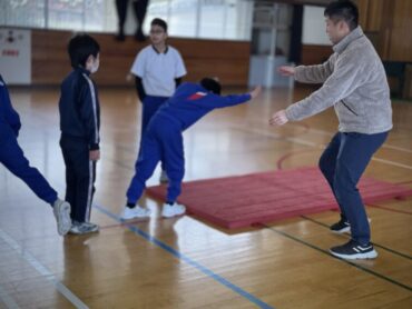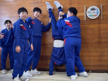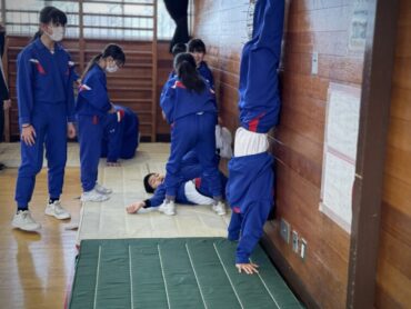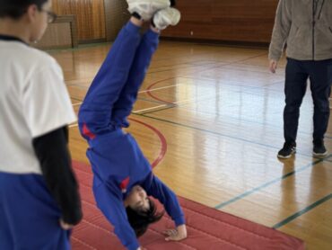 体育の授業でマット運動に取り組んでいました。先生や友達に補助してもらいながら、かべ倒立や倒立前転に挑戦していました。けがに気を付けながら、どんどん挑戦しましょう。