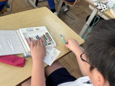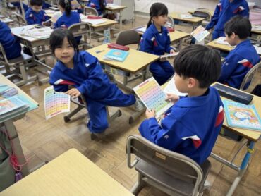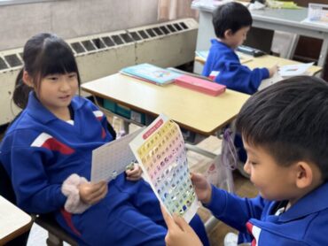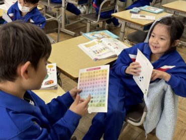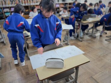 算数の授業で、隣の児童と問題を出し合っていました。正解したら、カードの答えの所に穴をあけることができます。問題を考えることも算数の力を付けることにつながりますね。