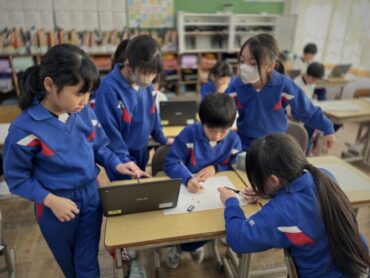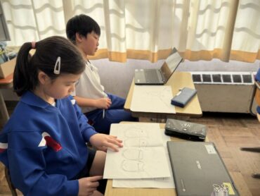 図工の時間には、学習専用端末を利用して、版画の下絵を描きました。2枚の紙に、手前の絵と背景の絵を描いています。版画で2枚の絵が組み合わせると、どのような雰囲気になるでしょう。
