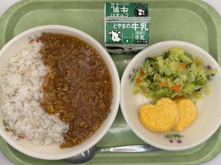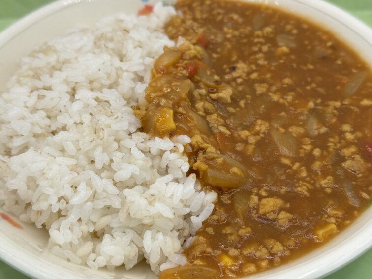 今日の給食のキーマカレーには、ひき肉と一緒に「大豆ミート」も入っています。いつものキーマカレーと比べて味はどうですか?よく味わいながら食べてみましょう。