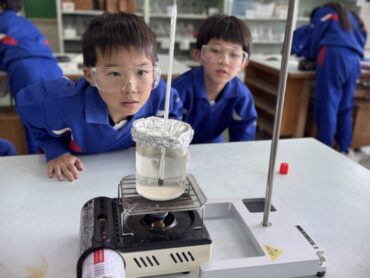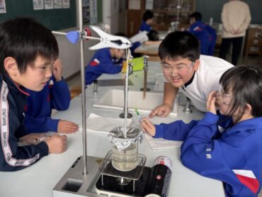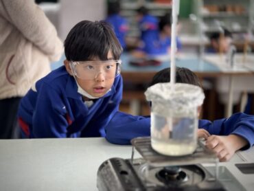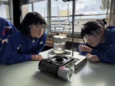理科の実験で水をガスコンロで温め、水の温度が何度まで上がるのか調べていました。真剣に温度計を見つめるまなざしがすてきですね。知りたい!調べたい!という旺盛な意欲を感じました。