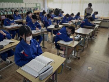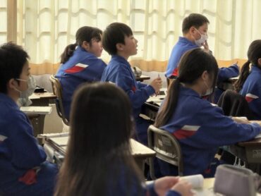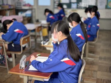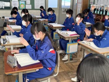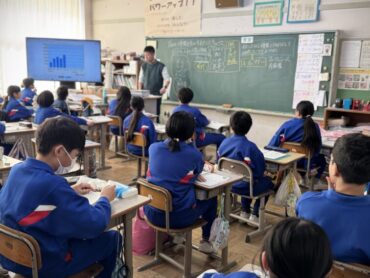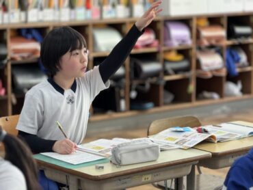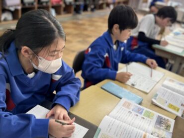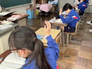 国語「考えることを考え続ける」授業です。この文章は説明文で、どのような文章構成になっているのかについて、考えているところでした。時間が来て、区切りの場所を挙手しました。まだ迷っているような様子でした。