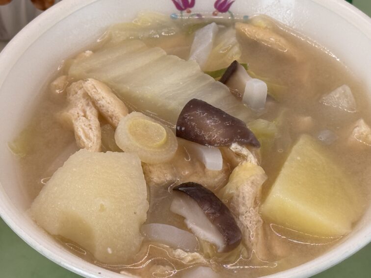 今日の給食の「おから入り和風ミートローフ」には、卵や牛乳は使用せず、豚ひき肉や野菜と一緒に乾燥のおからパウダーを使用しています。生椎茸の軸も捨てずに細かくみじん切りにして使いました。傘の部分は薄く切って「酒かす汁」に使い、余すことなく食べることができます。