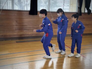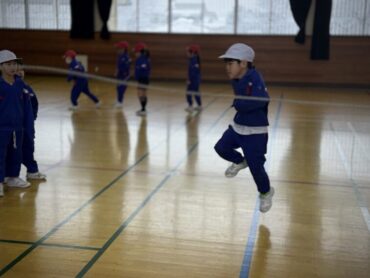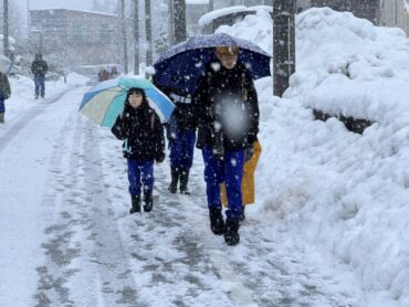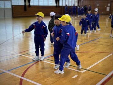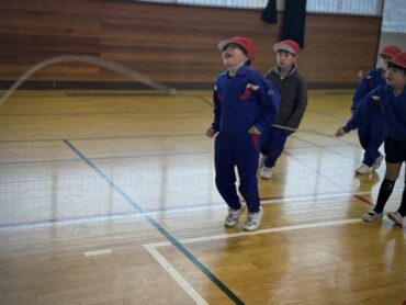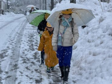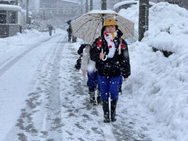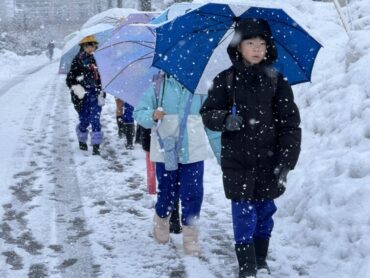 雪がしきりに降る中の登校となりました。登校班長が安全にみんなを率いてきてくれました。