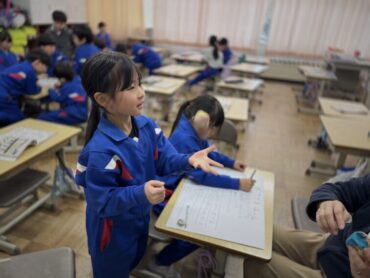 算数の練習問題に取り組んでいました。一人でどんどん進める児童、友達に教える児童、友達から教わる児童、それぞれ一生懸命に学習していました。