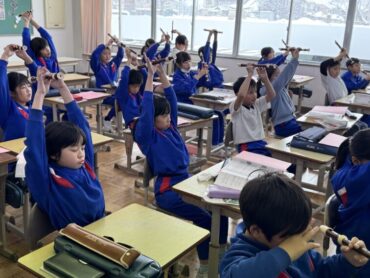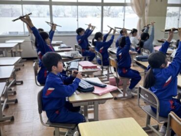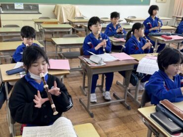 音楽で「パフ」のリコーダー練習をしていました。リコーダーを両手で上に持ち上げ、いい姿勢になったところで演奏開始です。どの教科の学習でも姿勢が大事です。