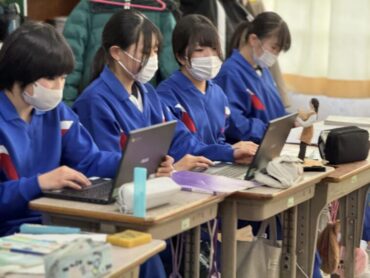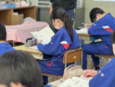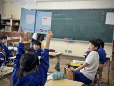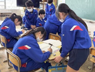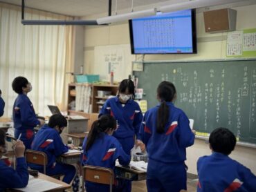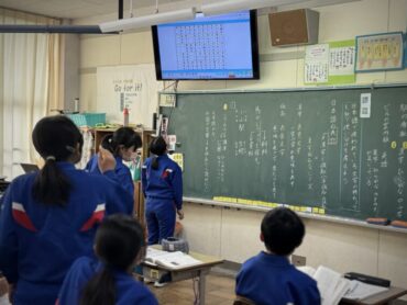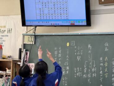 5限は国語です。日本語の文字についての学習でした。教科書を読んだ後、万葉仮名で自分の名前を書いてみました。大型テレビに映っている50音のから自分の名前に当たる漢字を1字ずつ書きました。