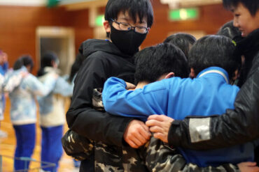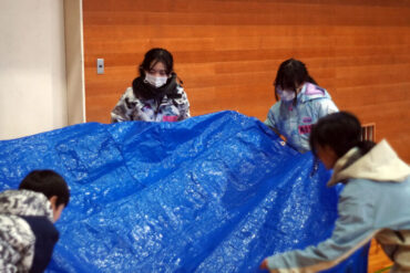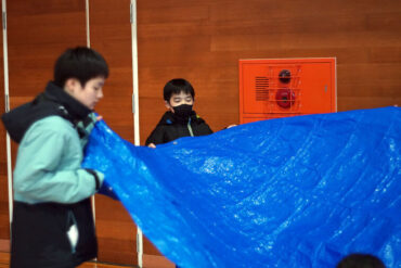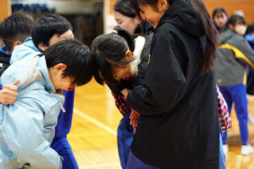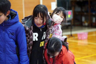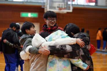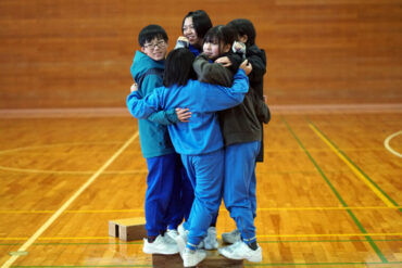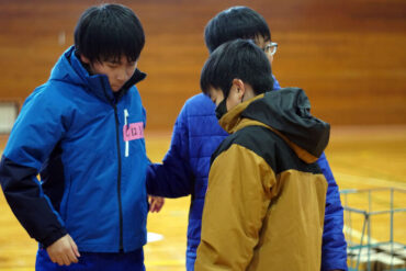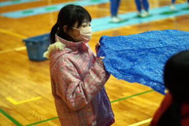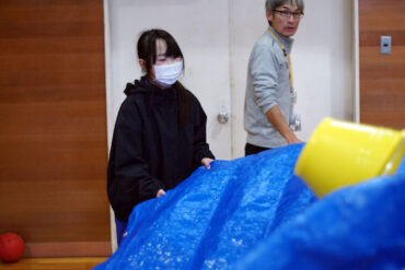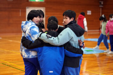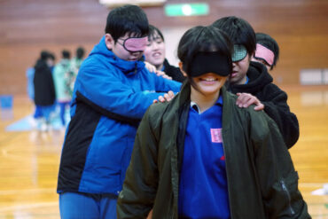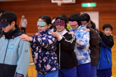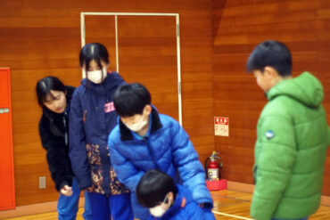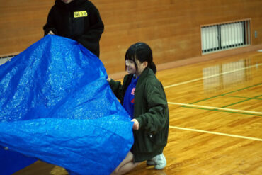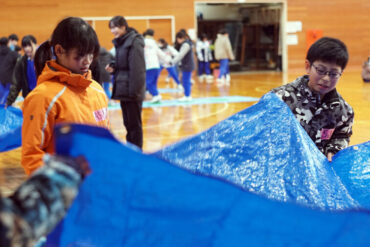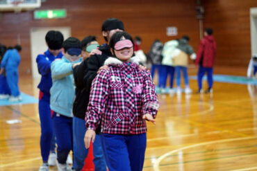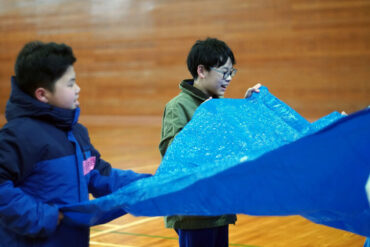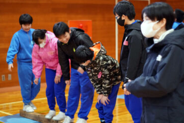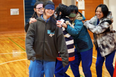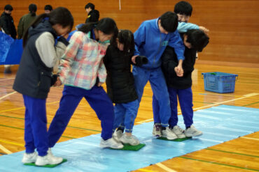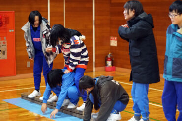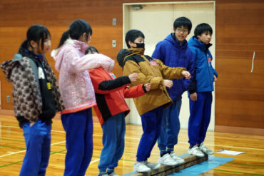 昼食後は体育館に移動して、5種目のイニシアチブゲームをしました。班ごとにメンバーで作戦を立て、協力して課題に挑戦しました。他校の人たちとも打ち解けられ、とてもよかったです。