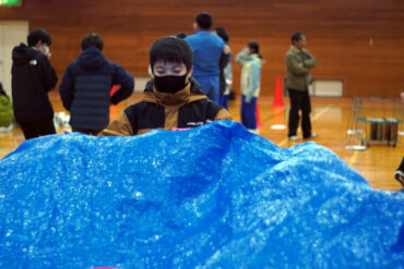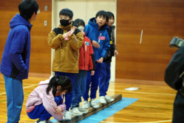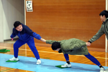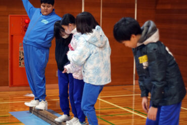一本の板の上に乗り、「誕生日の早いもの順」「名前のあいうえお順」等、板から落ちずに並び替えをします。